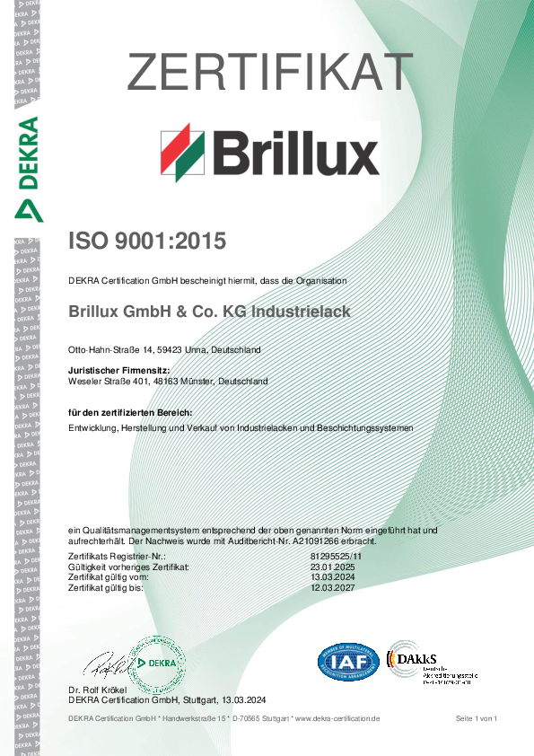 Brillux Industrial Coatings established a company-wide quality management system as early as 1995. Certification in accordance with DIN EN ISO 9001 is a given for us. This certificate is proof of the high expectations we have of ourselves.