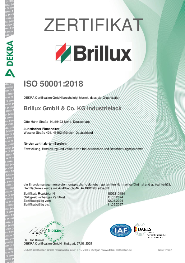With the introduction of an energy management system in accordance with EN ISO 50001, Brillux has created a binding framework for measurably increasing energy efficiency and using resources sustainably. Our goal is continuous reduction in energy consumption – achieved through technical optimization, employee awareness and efficient processes. Certification commits us to regular audits, measurable targets and clearly defined responsibilities.